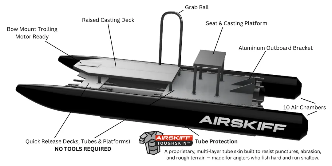 Easily assembled in minutes, no tools required! The front casting deck comes pre fitted to host a trolling motor, the grab rail has a MOLLE rack for attaching gear, and the rear seat/platform easily fits a cooler or tackle box.